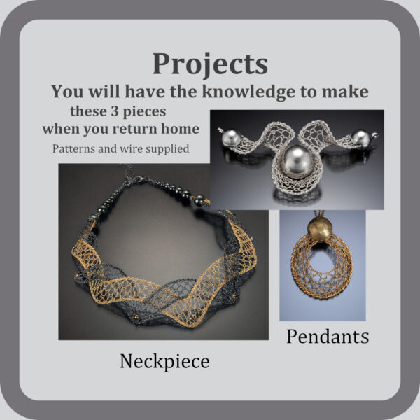 Dabei sind Lauran zwei Aspekte wichtig: Die Konzentration auf die speziellen Methoden der Arbeit mit Draht wird den Teilnehmerinnen helfen, die strukturelle Beschaffenheit von Metall und sein Potenzial für dreidimensionales Design zu verstehen. Der Schwerpunkt liegt auf der richtigen Spannung und der Technik, den Draht systematisch um die Nadeln zu führen, um präzise Muster zu erzielen. Darüber hinaus wird sie Methoden behandeln, um alle Drahtenden „verschwinden” zu lassen. Die Teilnehmerinnen werden mehrere Muster anfertigen, um den besonderen Umgang mit Draht zu verstehen.