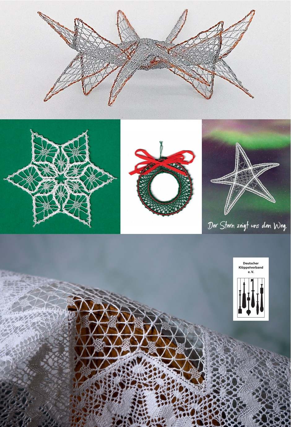 5 Klöppelbriefe mit weihnachtlichen Motiven von Barbara Corbet, Ute Klug, Martha Polansky, Brigitta Rost und Helena Orava